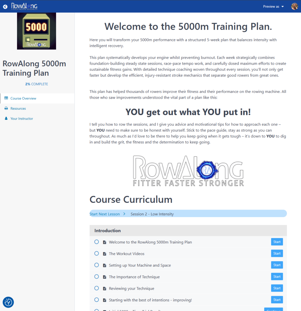 So I thought I’d plug this hole. And starting with the 5000m plan, I’ve made a formal “Course” version of it (which you can see to the left). The workouts are the same. The course contains links to the usual 5000m RowAlong training videos. But now there’s more background to the plan itself, how to make sure you’re starting properly, and then guidance, reasoning and motivation for each of the workouts.